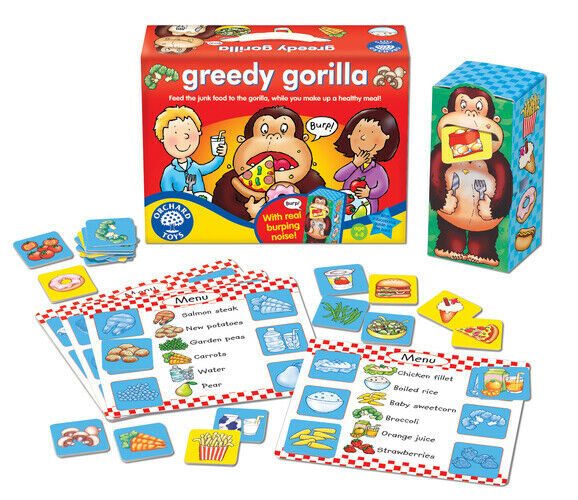 Voici un gorille très sympathique qui va se charger de manger les aliments trop caloriques « the junk food ». Pour cela, insérer les cartes jaune dans sa bouche pour le faire roter mais sans oublier de s'excuser s'il vous plait! Il faudra alors pour pouvoir gagner la partie, être capable de compléter le premier son menu équilibré, à partir de 5 ans et pour tout âge.