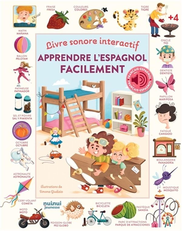 Un coffret contenant un livre sonore interactif qui permet aux enfants d'apprendre l'espagnol, tout en s'amusant ! Ce livre sonore guidera les tout-petits de manière simple et ludique dans l'apprentissage de la langue espagnole. Vingt pages colorées contiennent autant de décors - de la maison à la ville, de la mer à la montagne - grâce auxquels les … Un coffret contenant un livre sonore interactif qui permet aux enfants d'apprendre l'espagnol, tout en s'amusant ! Ce livre sonore guidera les tout-petits de manière simple et ludique dans l'apprentissage de la langue espagnole. Vingt pages colorées contiennent autant de décors - de la maison à la ville, de la mer à la montagne - grâce auxquels les enfants peuvent apprendre le vocabulaire le plus couramment utilisé. Ils découvriront ainsi quel nom donner en espagnol aux membres de la famille ou aux différentes parties du corps, quels mots utiliser pour définir leurs émotions ou pour marquer le temps en jours, mois et saisons : une façon astucieuse d'apprendre en jouant. Une voix en espagnol accompagne les enfants dans ce voyage, en expliquant le fonctionnement du livre, en présentant les thèmes de chaque page et en posant une série de questions pour évaluer le degré d'apprentissage. Cette voix est alternée avec celle d'un locuteur natif qui prononce correctement et très clairement les mots en espagnol.
